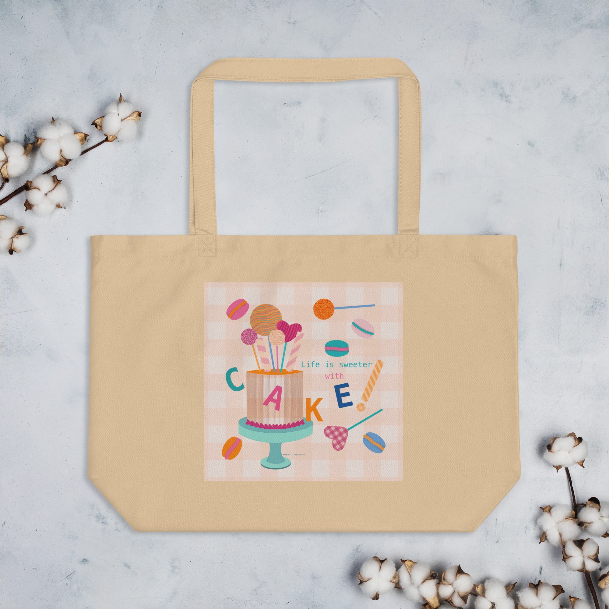 Life Is Sweeter With Cake - Large Organic Tote Bag in Oyster